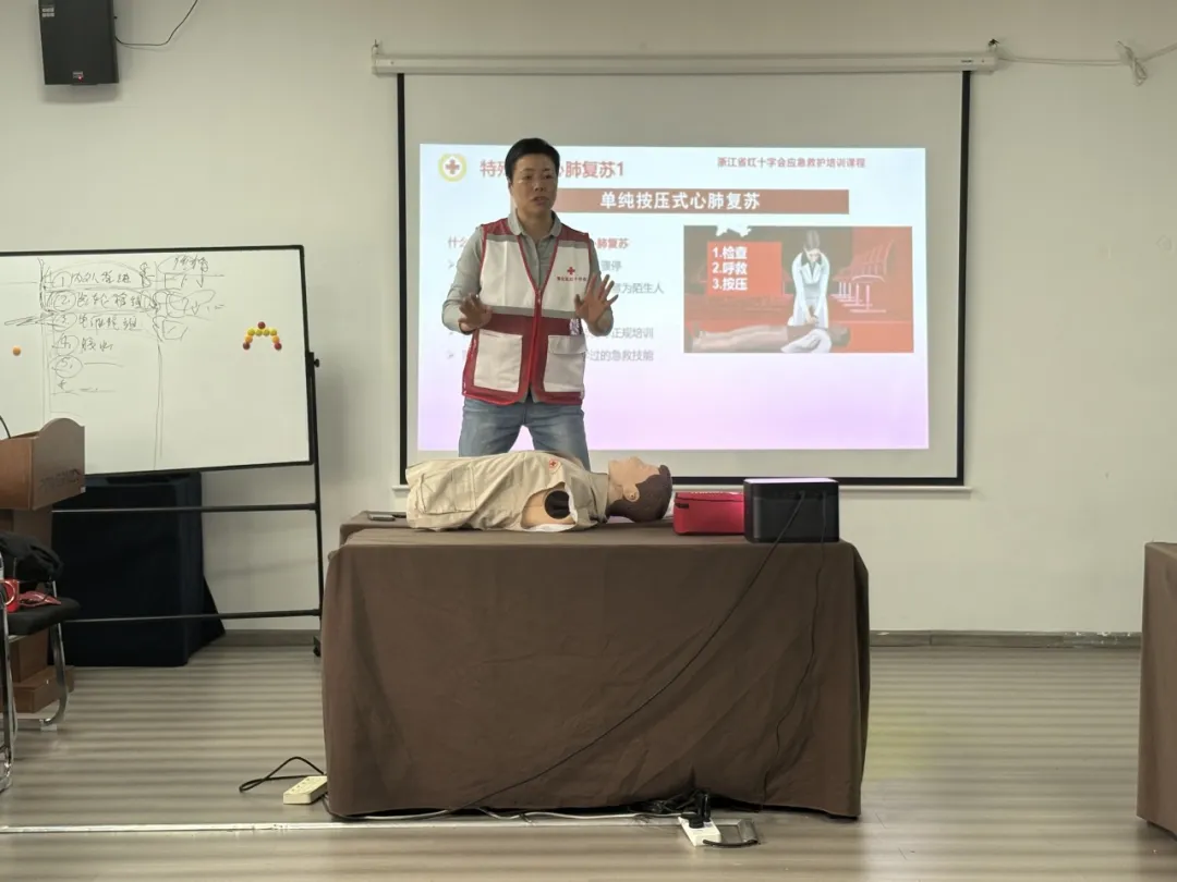 На месте проведения обучения г-жа У Кэцзюань, профессиональный инструктор из Общества Красного Креста Фэнхуа, доступно объяснила знания по оказанию первой помощи в чрезвычайных ситуациях, опираясь на свои прочные теоретические знания и обширный практический опыт. От ключевых моментов сердечно-легочной реанимации (СЛР) до процедур использования автоматических внешних дефибрилляторов (АВД) и техник перевязки ран — инструкторы использовали наглядные примеры и подробные демонстрации, чтобы сделать сложные знания по оказанию помощи в чрезвычайных ситуациях понятными для всех.